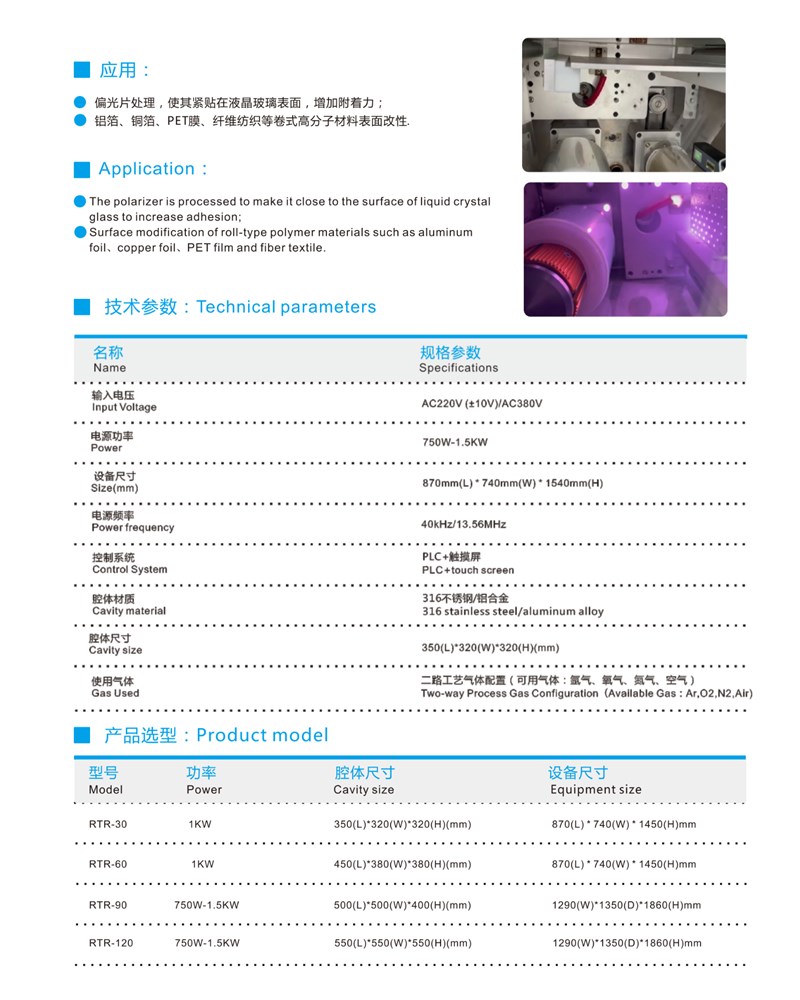 1. 管狀電結構,放電不受被處理物形態影響,處理均勻,使用不同張力產品處理,運動速度可調節,實現正反轉4. 合理的等離子反應空間,使產品處理更均勻